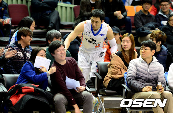 1쿼터 전자랜드 정영삼이 볼을 살리기 위해 관중석으로 몸을 던진후 팬들이 다친 곳이 없는지 살피고 있다.