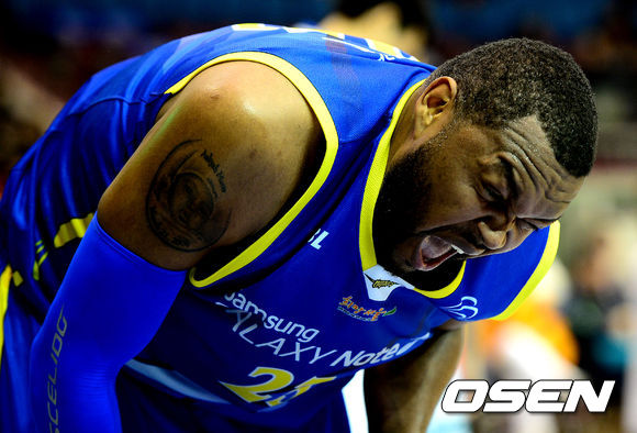 2쿼터 삼성 존슨이 슛 동작 도중 얼굴을 가격당하며 괴로워하고 있다.