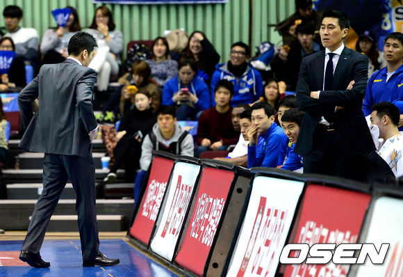 2쿼터 삼성 김상식 감독대행과 이상민 코치가 아쉬운 표정을 지으며 경기를 지켜보고 있다.