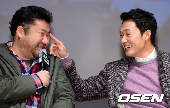 배우 박성웅이 고창석의 피어싱을 만져보고 있다.