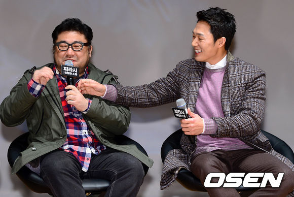 배우 고창석과 박성웅이 장난을 치고 있다.