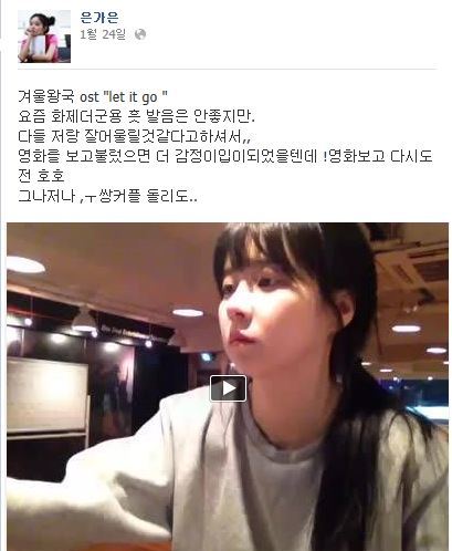 은가은은 지난달 24일 자신의 SNS에 “요즘 화제더군요. 흣 발음은 안 좋지만. 다들 저랑 잘 어울릴 것 같다고 하셔서. 영화를 보고 불렀으면 더 감정이입이 되었을텐데 영화보고 다시도전 호호. 그나저나 쌍꺼풀 돌리도”라는 글과 함께 '렛잇고(Let It Go)'를 직접 부른 동영상을 게재했다.