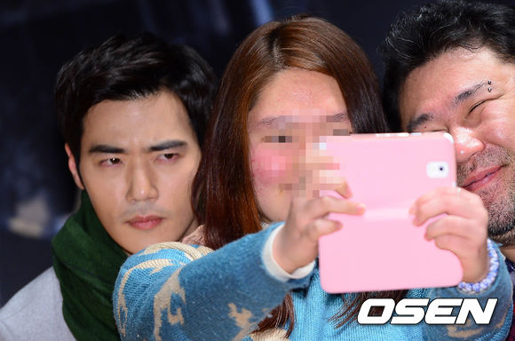 배우 김강우가 사진을 찍고 있는 고창석과 여성팬 뒤에서 장난을 치고 있다.
