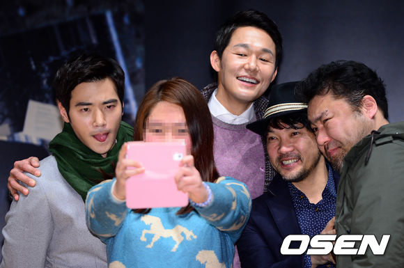 영화 찌라시 출연진이 여성팬과 사진을 찍고 있다.