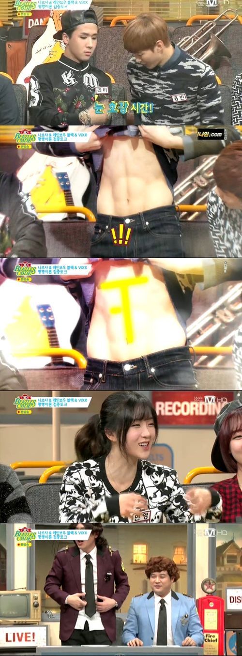 이날 MC들은 홍빈이 아무 때나 복근 노출하기를 좋아한다는 소문이 사실인지 확인에 나섰다. 그러나 빅스 멤버들은 “홍빈이 공식 촬영을 제외하곤 복근을 노출한 적이 없다”고 대신 해명했다.