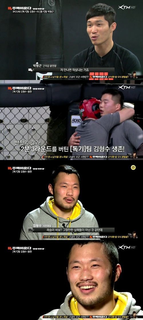 김형수는 4일 방송된 케이블채널 XTM ‘주먹이 운다-영웅의 탄생’에서 용기팀 윤성준, 홍영기를 차례로 제압했다. 마지막으로 박형근까지 이긴 김형수는 "펀치가 솜방망이 같다"고 낮잡았다.