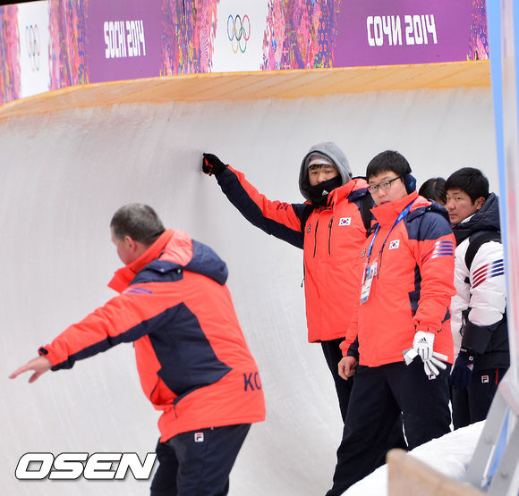 2014소치 동계올림픽 개막을 앞둔 4일(한국시간) 러시아 소치 산키 슬라이딩센터에서 김동현 원윤종 김선옥 봅슬레이 파일럿들과 이용 감독이 트랙워킹을 하고 있다.