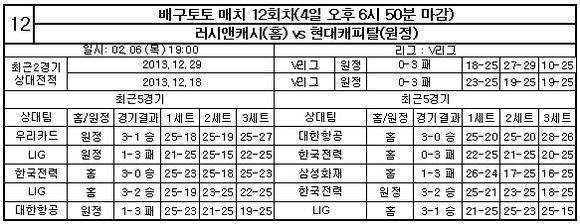 현재 러시앤캐시는 7승 14패로 6위, 현대캐피탈은 15승 6패로 2위를 달리고 있다. 지난 맞대결 세 경기에서는 현대캐피탈이 러시앤캐시에 단 한세트도 내주지 않으며, 세트 당 평균 6.4점차로 승리를 거뒀다. 한편 이번 배구토토 매치 12회차 게임은 6일 오후 6시 50분에 발매가 마감되며 경기가 모두 종료된 후에 결과가 공식 발표된다.