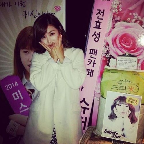 공개된 사진 속 전효성은 ‘전효성 팬카페 슈퍼스타’라는 문구가 써진 쌀 화환 앞에 서있다. 특히 쌀 가마니에 붙어 있는 사진과 같은 ‘꽃받침’ 포즈를 하고 있는 전효성의 센스가 돋보인다.