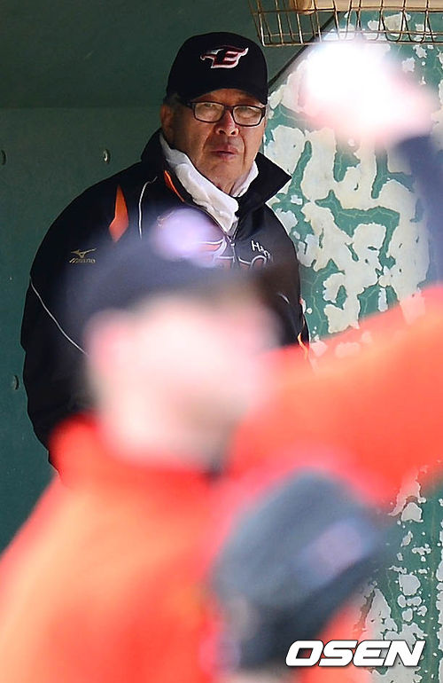 5일 오전 일본 오키나와 고친다구장에서 김응룡 감독이 앨버스의 훈련을 지켜보고 있다.