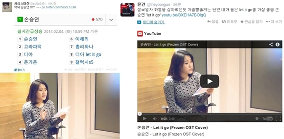 손승연은 지난 4일 자신의 트위터에 '렛 잇 고' 커버 영상을 공개, 포털사이트 실시간 검색어 순위에 오르며 화제를 모았다. 이어 신승훈과 윤건, 허각, 그리고 하하 등이 손승연을 칭찬하며 응원메시지를 보냈다.