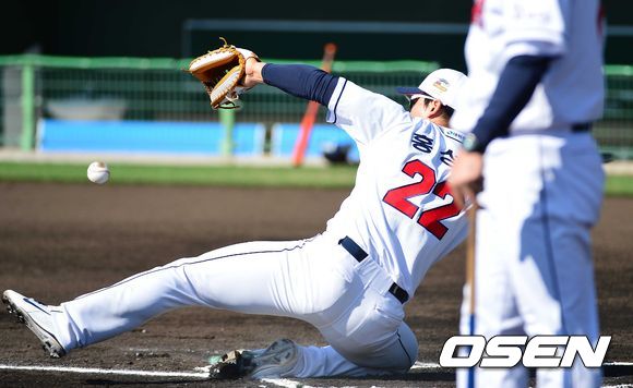 홍성흔이 수비 훈련 중 포수 포지션으로 나서 동료들과 호흡을 맞추고 있다./dreamer@osen.co.kr