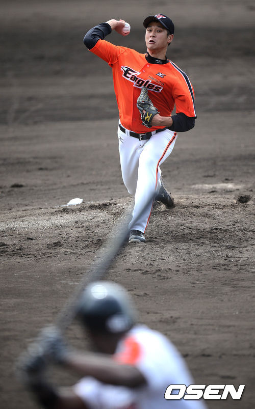 5일 오후 일본 오키나와 고친다구장에서 열린 한화의 라이브 배팅 훈련에서 윤규진이 피칭을 하고 있다.