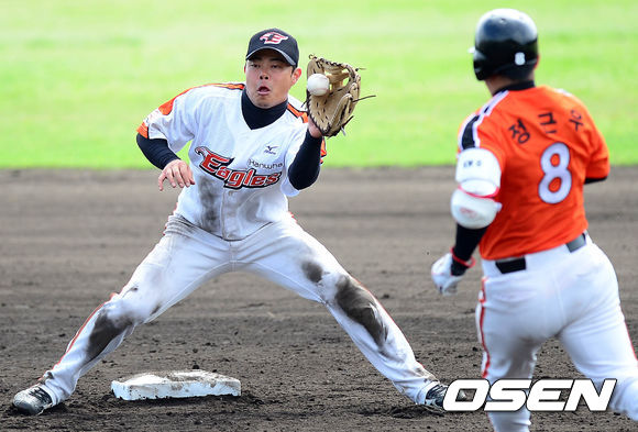 5일 오후 일본 오키나와 고친다구장에서 열린 한화의 라이브 배팅 훈련에서 이학준이 도루를 시도하던 정근우를 태그아웃 시키고 있다.