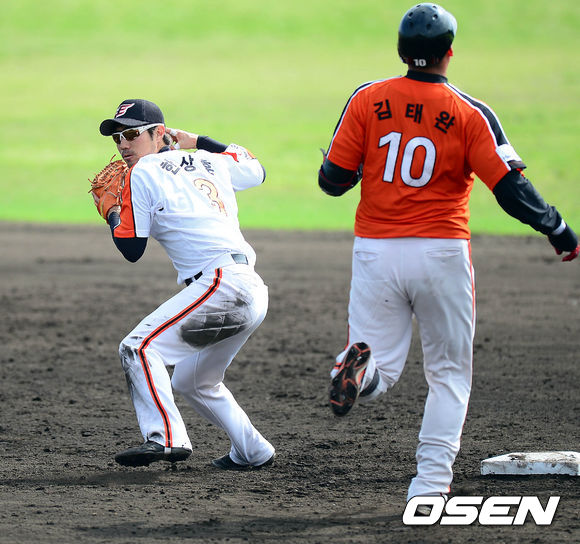 5일 오후 일본 오키나와 고친다구장에서 열린 한화의 라이브 배팅 훈련에서 더블 플레이 상황이 나오자 한상훈이 1루로 송구하고 있다.