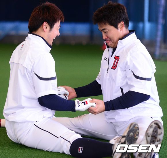 홍성흔과 최주환이 스트레칭을 함께하고 있다./dreamer@osen.co.kr