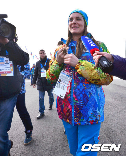 2014소치 동계올림픽 개막을 앞둔 5일(한국시간) 러시아 소치올림픽 빌리지에서 러시아 장대높이 뛰기 선수 '미녀새' 이신바예바가 입촌식에 참석해 취재진과 인터뷰를 하고 있다.