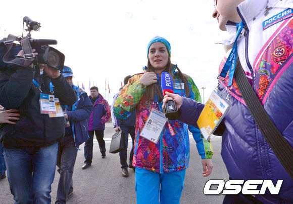 2014소치 동계올림픽 개막을 앞둔 5일(한국시간) 러시아 소치올림픽 빌리지에서 러시아 장대높이 뛰기 선수 '미녀새' 이신바예바가 입촌식에 참석해 취재진과 인터뷰를 하고 있다.