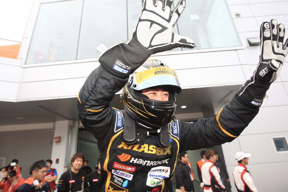 아트라스BX레이싱팀 조항우 감독이 2013시즌 6전 슈퍼6000 우승을 차지한 후 기뻐하고 있다.(위), 지난 2013시즌 슈퍼레이스 챔피언십 최종전 슈퍼6000 경기장면(아래) / CJ 슈퍼레이스 제공.