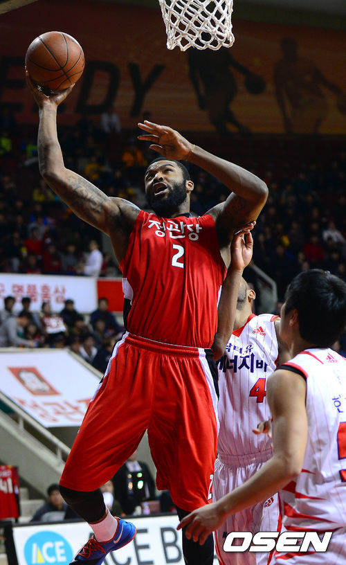 3쿼터 KGC 에반스가 골밑슛을 시도하고 있다.