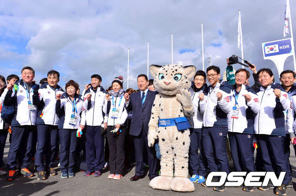 2014소치 동계올림픽 개막을 앞둔 5일(한국시간) 대한민국 선수단이 러시아 소치 올림픽 빌리지에서 열린 입촌식에 참석했다. 대한민국 선수단이 기념촬영을 하고 있다.
