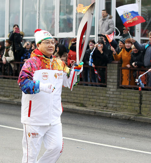 2014소치 동계올림픽 개막을 앞둔 5일(한국시간) 러시아 소치 아들레르 래리나 거리에서 김진선 2018 평창동계올림픽 조직위원장이 성화주자로 달리고 있다.