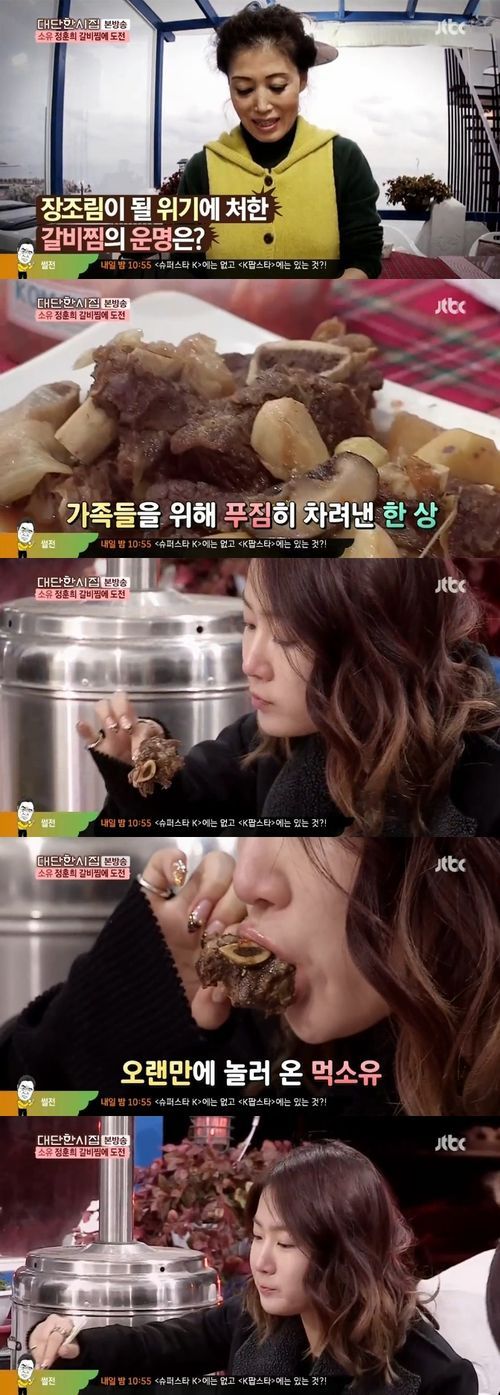 5일 오후 방송된 JTBC 예능프로그램 ‘대단한 시집’에서는 운전 면허 시험에 합격한 소유를 위해 갈비찜을 만든 정훈희의 모습이 담겼다. 소유는 시어머니 손길이 담긴 갈비찜을 아주 맛있게 먹었다.