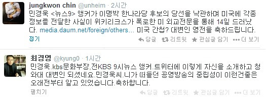 그러자 진중권 교수는 이날 자신의 트위터를 통해 "민경욱 '뉴스9' 앵커가 이명박 한나라당 후보의 당선을 낙관하며 미국에 각종 정보를 전달한 사실이 위키리크스가 폭로한 미 외교전문을 통해 14일 드러났다"며 "미국 간첩? 대변인 영전을 축하드립니다"라고 비아냥거리는 독설을 날렸다.