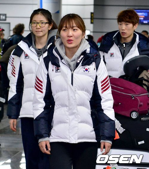 박승희 심석희 이한빈이 소치 국제공항을 통해 입국하고 있다.