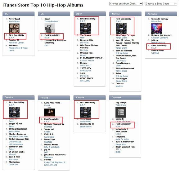 B.A.P는 지난 5일(한국시간) 발표된 '아이튠즈 스토어 톱10 힙합 앨범 차트(iTunes Store Top 10 Hip-Hop Albums Chart)'에서 일본과 캐나다에서 1위, 미국과 영국에서는 2위를 차지했다.