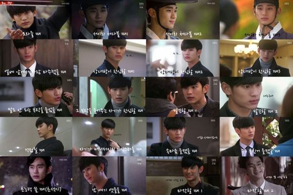 화제가 되고 있는 김수현의 20가지 표정연기에는 첫 회 도민준이 '이화(김현수 분)를 도와줄 때'를 시작으로 조선시대 선비가 되어 '이화를 쳐다볼 때'는 무려 세가지 버전이, 그리고 ‘엘리베이터 앞에서 사람과 마주쳤을 때’와 ‘한심하게 쳐다볼 때’의 모습 등이 담겨 있다.