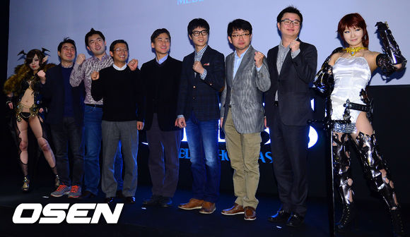 네오위즈 이기원 대표, 블레스스튜디오 최관호 대표, 한재갑 디렉터 등 개발진들이 포토타임을 갖고 있다.