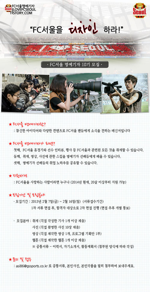 FC서울 명예기자 10기 모집에 관한 자세한 내용은 FC서울 홈페이지(http://www.fcseoul.com)를 통해 확인 할 수 있다.