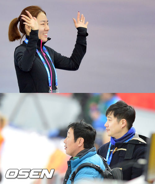 이상화가 SBS에서 스피드 스케이트 현지 중계를 맡은 김관규 해설과 배성재 캐스터(아나운서)에게 인사를 하고 있다.
