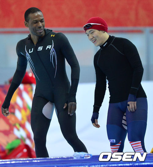 스피드스케이팅 대표팀이 6일(한국시간) 러시아 소치 아들레르 아레나 경기장에서 훈련을 하던 중 모태범이 미국 대표팀 데이비스와 즐겁게 얘기를 나누고 있다.