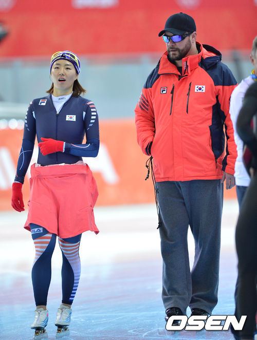 스피드스케이팅 대표팀이 6일(한국시간) 러시아 소치 아들레르 아레나 경기장에서 이상화와 모태범이 훈련을 하고 있다.