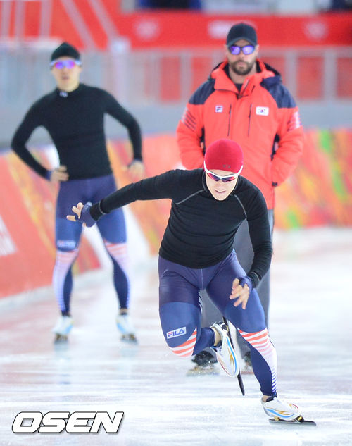스피드스케이팅 대표팀이 6일(한국시간) 러시아 소치 아들레르 아레나 경기장에서 모태범이 훈련을 하고 있다.