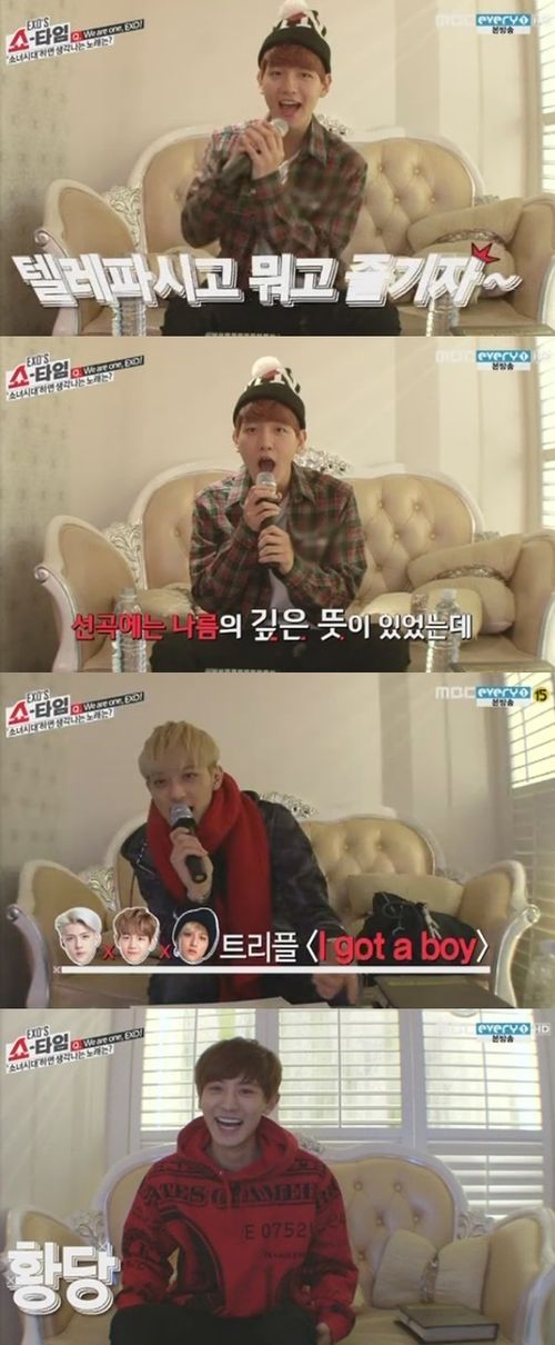 백현은 "중국 멤버들이 있으니, 그들이 아는 신곡을 선택해야겠다"라고 멤버들을 배려해 선택했지만, 전원 일치에는 실패했다. 또한 찬열은 '소녀시대'를 선곡해 눈길을 끌었다.