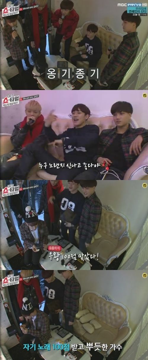 엑소 멤버들이 노래방에서 '으르렁'을 부르고 100점을 맞자 기뻐했다.