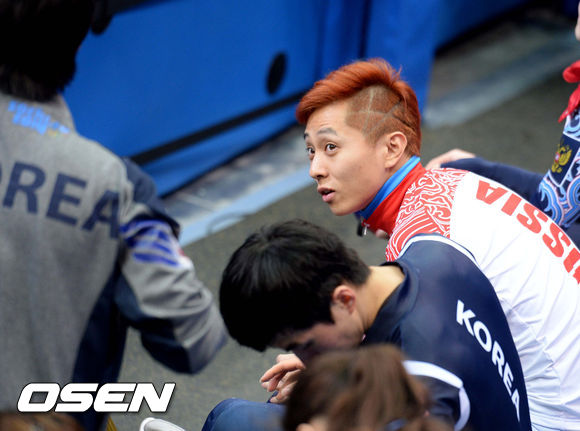 쇼트트랙 대표팀이 6일(한국시간) 러시아 소치 아이스버그 쇼트트랙 경기장에서 훈련을 마쳤을때 러시아 대표팀 안현수가 러시아 훈련 시간에 맞춰 경기장으로 들어서며 대한민국 선수들과 얘기를 나누고 있다.