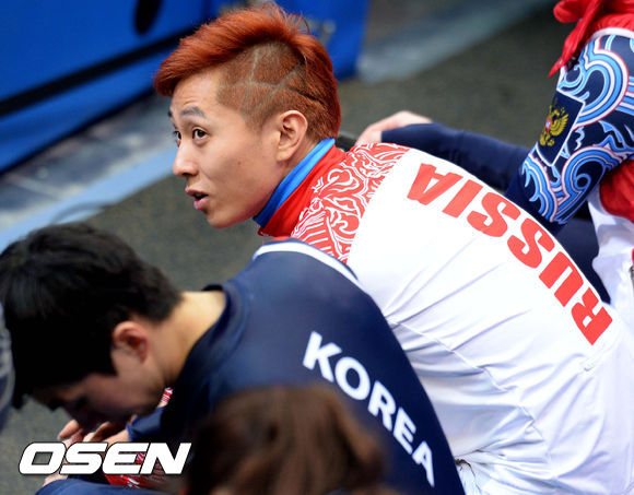 쇼트트랙 대표팀이 6일(한국시간) 러시아 소치 아이스버그 쇼트트랙 경기장에서 훈련을 마쳤을때 러시아 대표팀 안현수가 러시아 훈련 시간에 맞춰 경기장으로 들어서며 대한민국 대표팀 선수들과 만나고 있다.