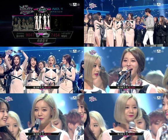걸스데이는 6일 오후 방송된 엠넷 '엠카운트다운'에서 타이틀곡 '썸씽(Something)'으로 에일리의 '노래가 늘었어'를 꺾고 1위 트로피를 거머쥐었다.