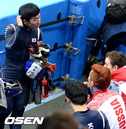 쇼트트랙 대표팀이 6일(한국시간) 러시아 소치 아이스버그 쇼트트랙 경기장에서 훈련을 마쳤을때 러시아 대표팀 안현수가 러시아 훈련 시간에 맞춰 경기장으로 들어서며 대한민국 이호석과 얘기를 나누고 있다.