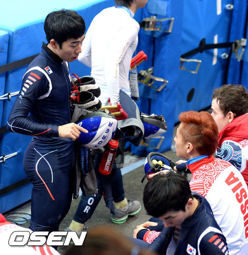쇼트트랙 대표팀이 6일(한국시간) 러시아 소치 아이스버그 쇼트트랙 경기장에서 훈련을 마쳤을때 러시아 대표팀 안현수가 러시아 훈련 시간에 맞춰 경기장으로 들어서며 대한민국 이호석과 얘기를 나누고 있다.