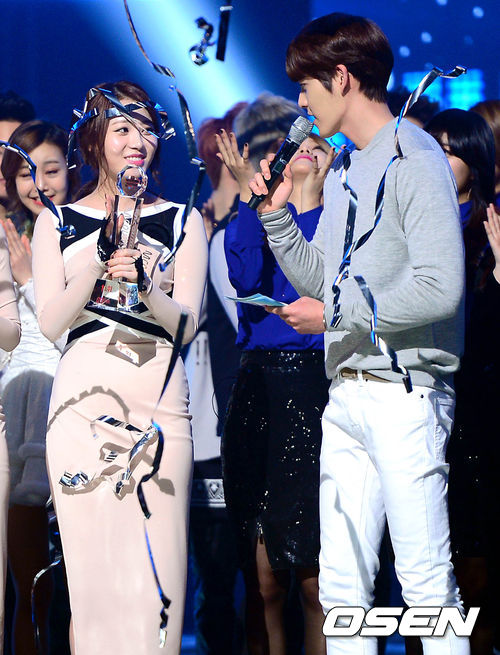 6일 오후 서울 상암동 CJ E&M에서 진행된 엠넷 ‘엠카운트다운’(엠카) 생방송 무대에서 MC 김우빈이 1위를 차지한 걸스데이 유라에게 트로피를 건네고 있다.
