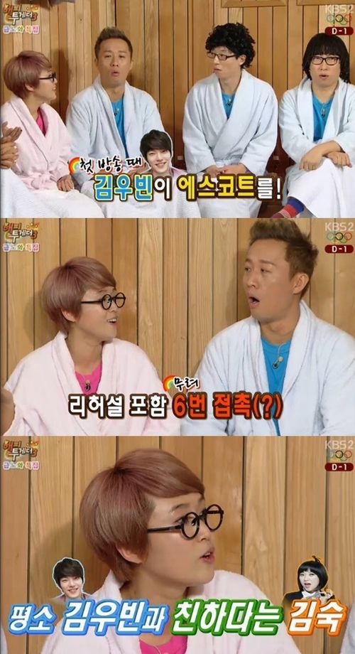 이어 "김숙이 김우빈과 친하다고 평소에 자랑했었다. 그래서 사실 확인을 했더니, 김우빈이 당황했다"고 재연해 웃음을 자아냈다.