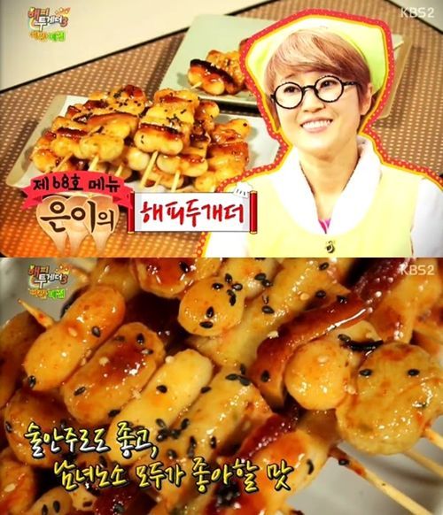 이날 송은이의 떡꼬치인 '해피두개더'가 야간 매점 메뉴로 올라갔다. 이 메뉴의 레시피는 조랭이 떡과 어묵을 물에 데친 후 꼬치에 꽂아 비빔면 소스와 꿀을 2:1로 섞어 바르는 것으로 간단하다.