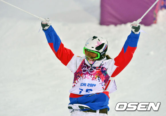6일(한국시간) 러시아 소치 산악 클러스터 로사 쿠토르 익스트림 파크에서 열린 프리스타일 스키 모굴 1차 예선 경기에서 러시아 선수가 경기를 마친 후 자국 팬들에게 인사를 하고 있다.