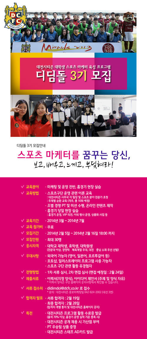 ‘디딤돌’ 3기의 참가 접수기간은 2014년 2월 5일부터 2월 16일까지다. 참가비는 무료이고, 모집 인원은 최대 30명이다. 전문대 이상의 대학교 재학생 · 휴학생 · 대학원생 모두 참여할 수 있다. 자세한 내용은 대전 시티즌 홈페이지에서 확인할 수 있다.
