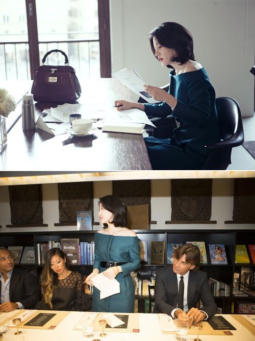 이영애가 한식 만찬을 앞두고 연설을 준비하는 모습과 특별 한식 만찬을 공동 주최한 배우 이영애(가운데)가 만찬에서 연설을 하고 있는 모습. 아래 사진 왼쪽부터 배재현 주이한국대사 내외, 배우 이영애, 파트리지오 디마르코(Patrizio di Marco) 구찌 사장 겸 최고 경영자가 구찌 뮤제오에서 포즈를 취하고 있다.